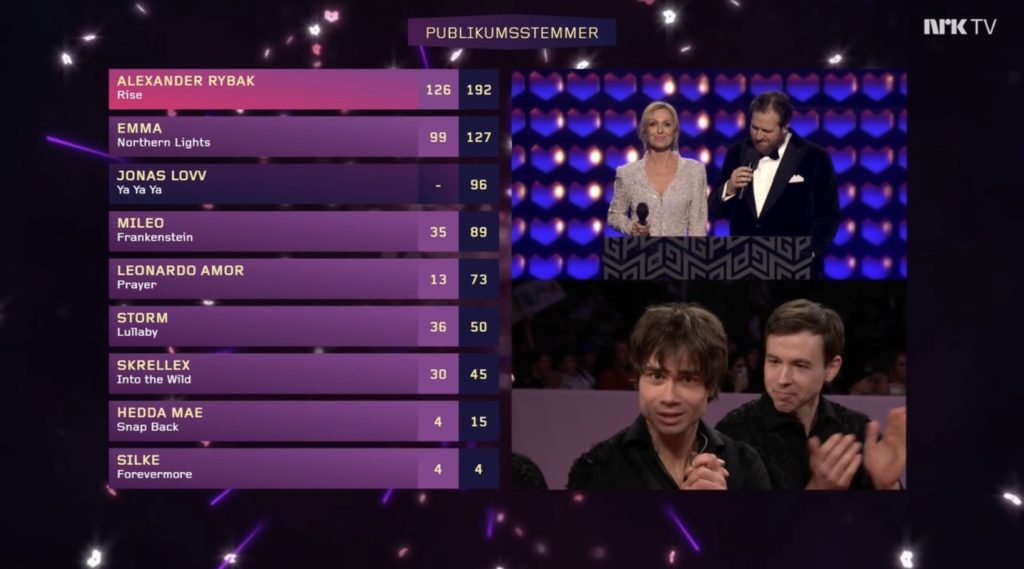Jonas Lovy obtiendra 169 points du public pour un total de 265 points au total. Alexandre Rybak finira 2ème avec 192 points et Emma (la favorite de la soirée) avec un totaé de 127 poins. Mileo (et c’est la grande surprise) n’obtient que 89 points en finale du MGP 2026 norvégien.