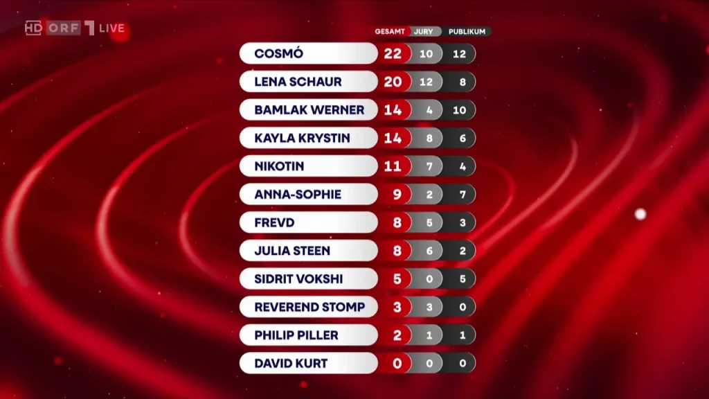C’est à la surprise générale de ce site c’est l’artiste Cosmo avec la chanson « Tanzschein » qui remporte l’émission Vienna Calling – Wer singt für Österreich ?
