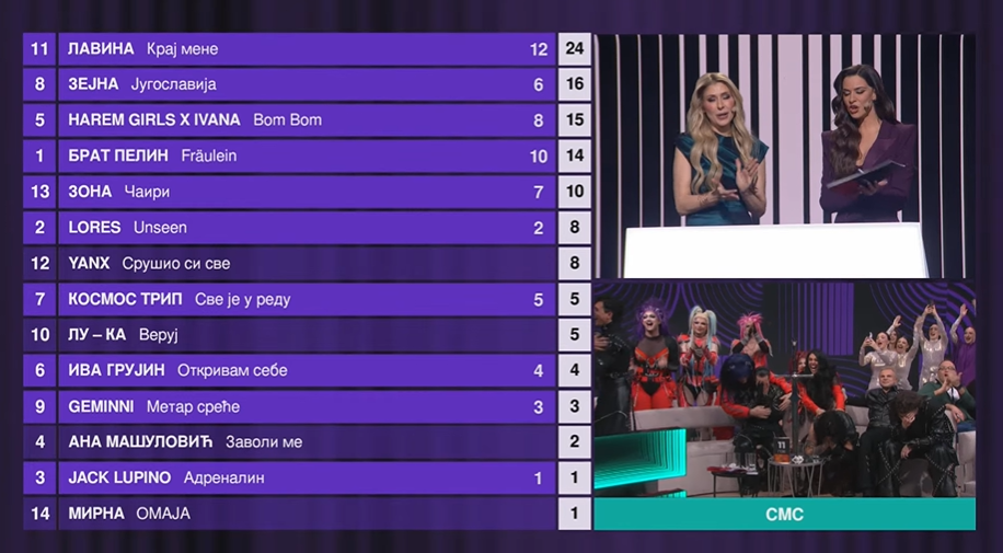 Durant l’attenre des votes, une vidéo hommage a d’abord été diffusée. Ensuite, Sergej Ćetković a interprété la chanson irlandaise victorieuse de 1984, « Hold Me Now », suivi de Jovana Nikolić avec « Everyway That I Can » (Turquie 2003). Le relais est ensuite passé à Tijana Bogičević, qui a chanté « Heroes » (Suède 2015) et « Arcade » (Pays-Bas 2019). Puis, Džordži a interprété « Soldi » (Italie 2019) et « Zitti e Buoni » (Italie 2021). Enfin, Sanja Vučić a chanté « Queen Of The King) (Norvège Eurovision 2023) et la chanson « Tattoo » (Suède, Eurovision 2023). Le programme s’est conclu avec Stefan Popović, qui a interprété « Espresso Macchiato » (Estonie 2025).