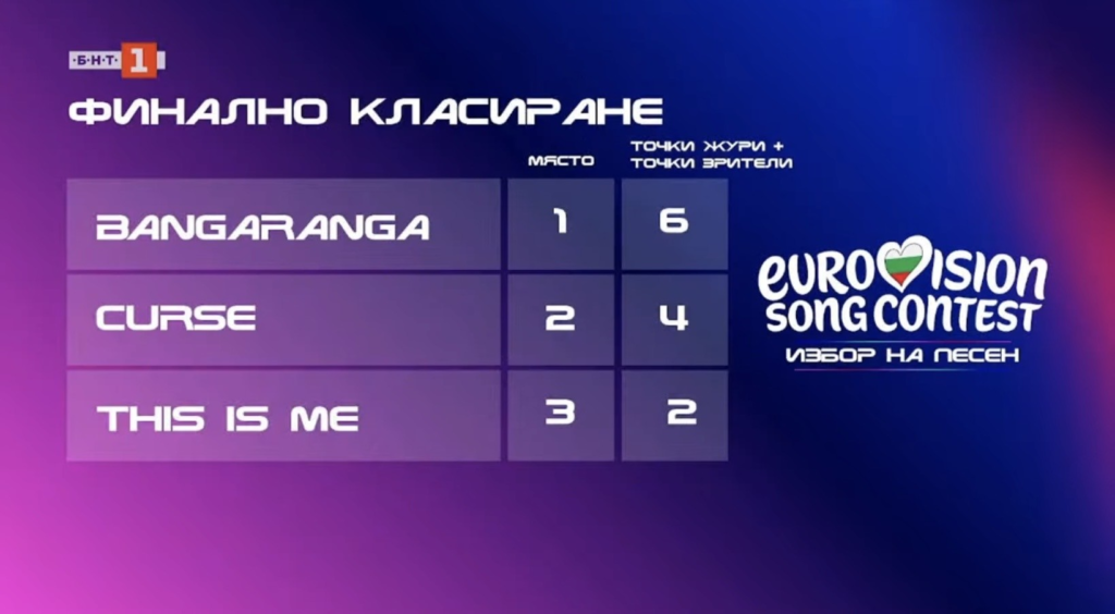 Les votes ont été sans appels là aussi puisqu’autant le public que le jury étaient d’accord sur le choix du thème de « Bangaranga ». Cette chanson a des accents indiens et, de l’avis de ce site, risque de ne pas qualifier ce pays en finale du Concours Eurovision 2026. Le titre fait également très éparpillé et se perd dans le style de musique. C’est bien dommage.