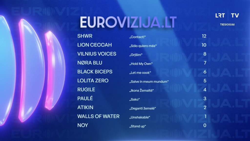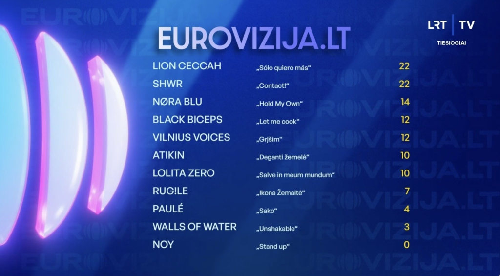Comme vous le constatez il y a eu 2 ex-aequo hier soir, mais c’est le vote du public qui prime. Lion Ceccah s’adjuge cette finale de l’Eurovijiza.LT 2026 et représentera la Lituanie au Concours Eurovision 2026.